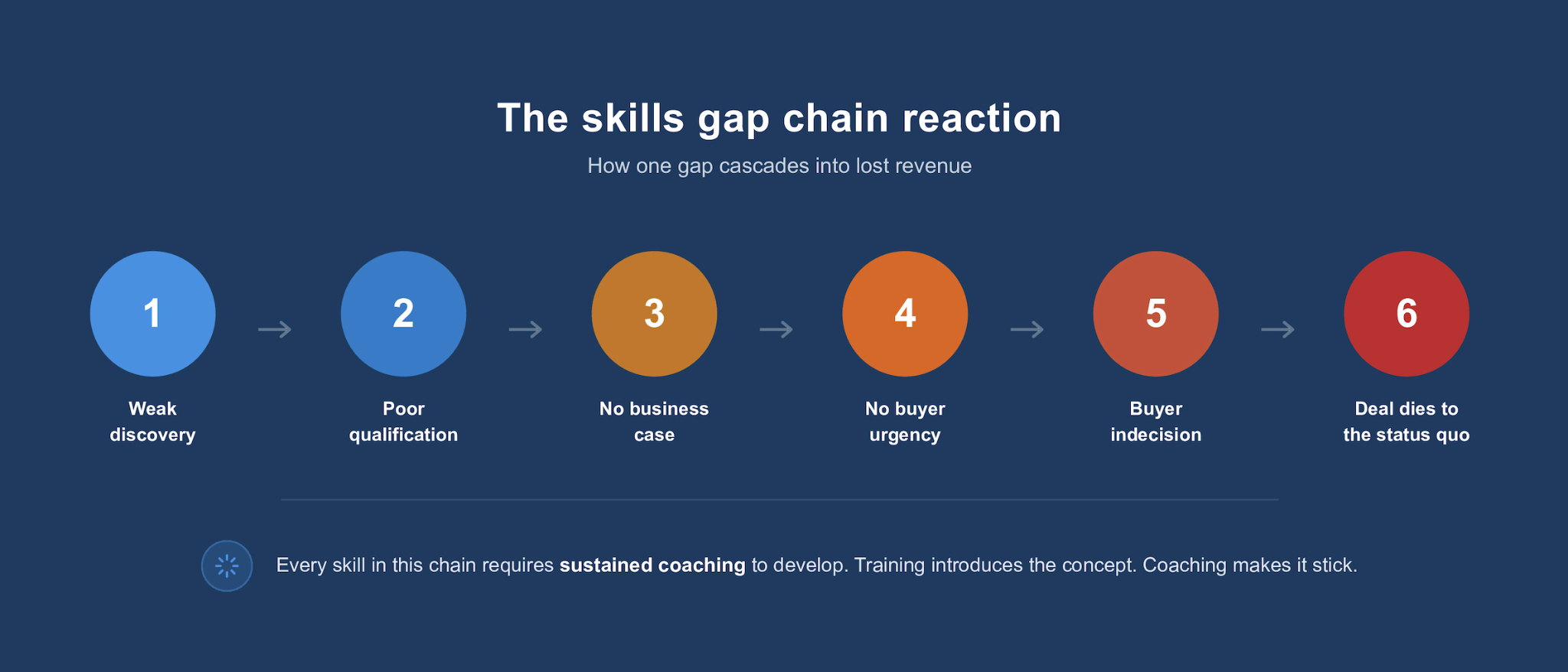 - The skills gaps driving deal loss, including discovery, business acumen, and qualification, are all coaching-dependent capabilities